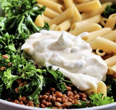 Salade de penne colorée et vinaigrette crémeuse à l’érable
