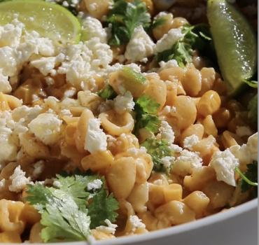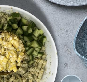 Salade de pâtes fraîche au maïs grillé, feta et lime